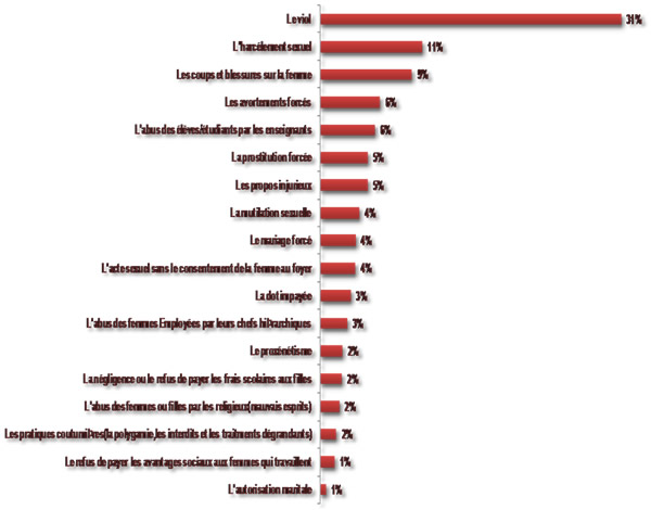 Sur 950 personnes interrogées à Kinshasa, 31% ont reconnu que le viol est l’une des manifestations la plus importante des violences sexuelles commises à l’endroit des femmes. Le harcèlement sexuel (11%) et les coups et blessures (9%) viennent compléter la liste des faits importants des violences sexuelles. Le mariage forcé, phénomène très en vogue dans un contexte socioéconomique faible, est également évoqué par les femmes (5%).