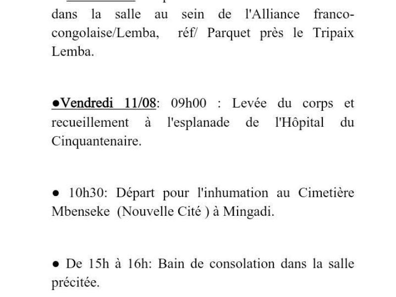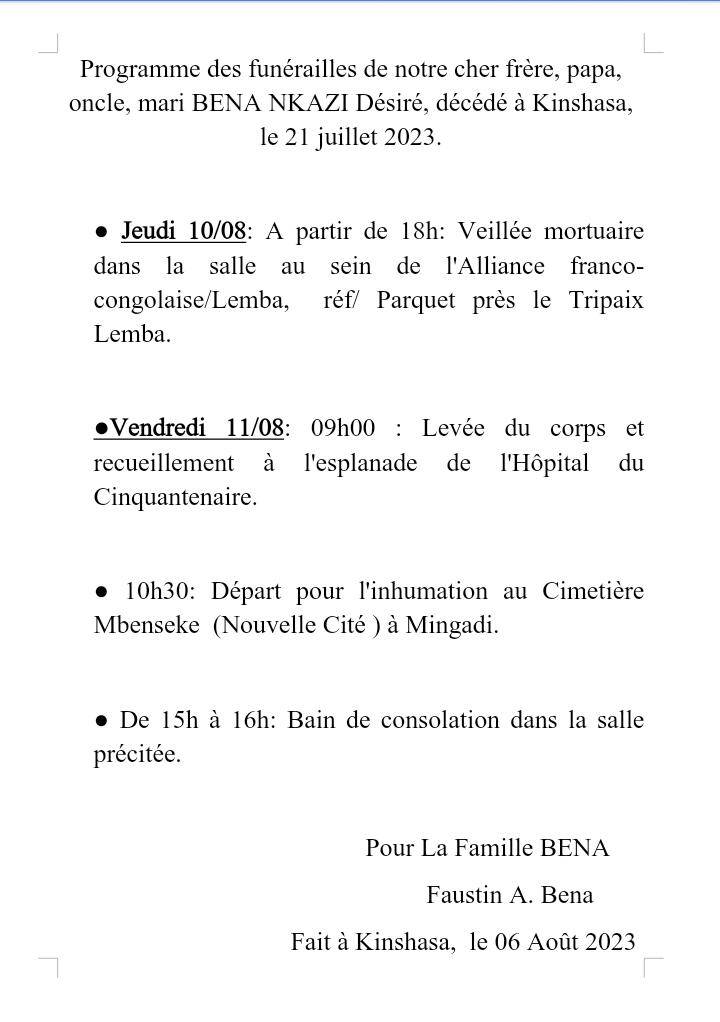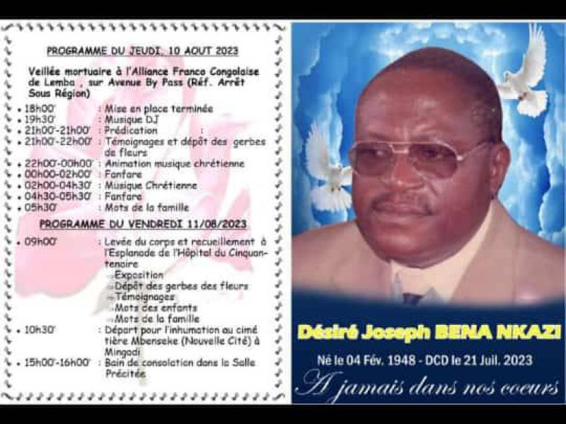 Voici le programme des obsèques de Monsieur DESIRE JOSEPH BENA NKADI ,