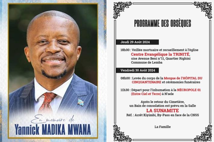 JEUDI 29 Août 2024: 18h00 veillée mortuaire et recueillement à l'église Centre Evangélique la Trinité, sise avenue Beni numéro 11, Q/Righini C/Lemba