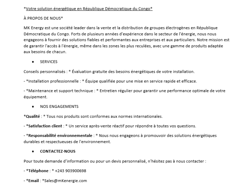 spécifiques sur les types de générateurs qu'ils offrent ou leurs caractéristiques, fais-le moi savoir, pour plus d informations veullez m appeler