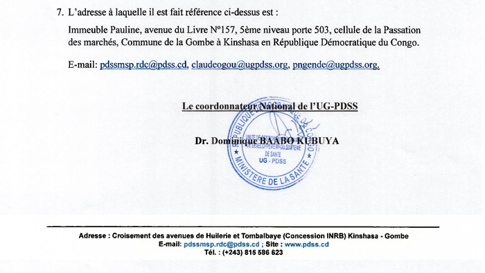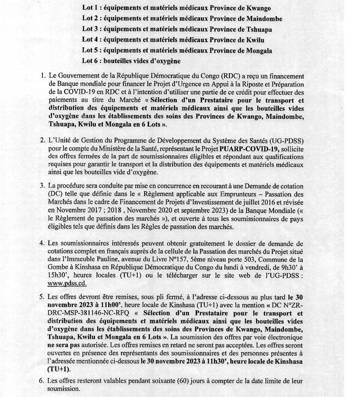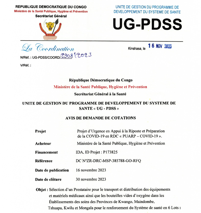 Sélection d’un Prestataire pour le transport et distribution des équipements et matériels médicaux ainsi que les bouteilles vides d’oxygène dans les Établissements des soins des Provinces