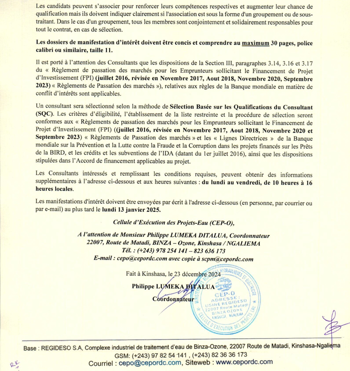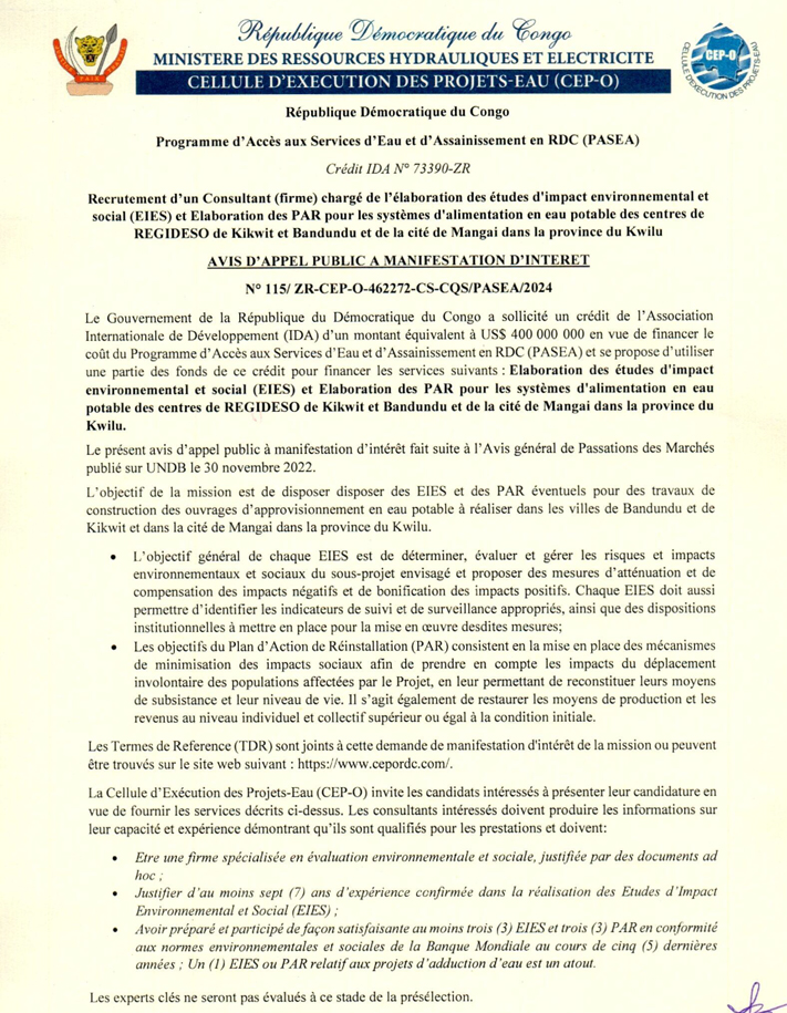 Consultant (firme) chargé de l'élaboration des EIES et Elaboration des PAR pour les systèmes d'alimentation en eau potable des centres de REGIDESO de Kikwit et Bandundu et de la cité de Mangai dans la province du Kwilu