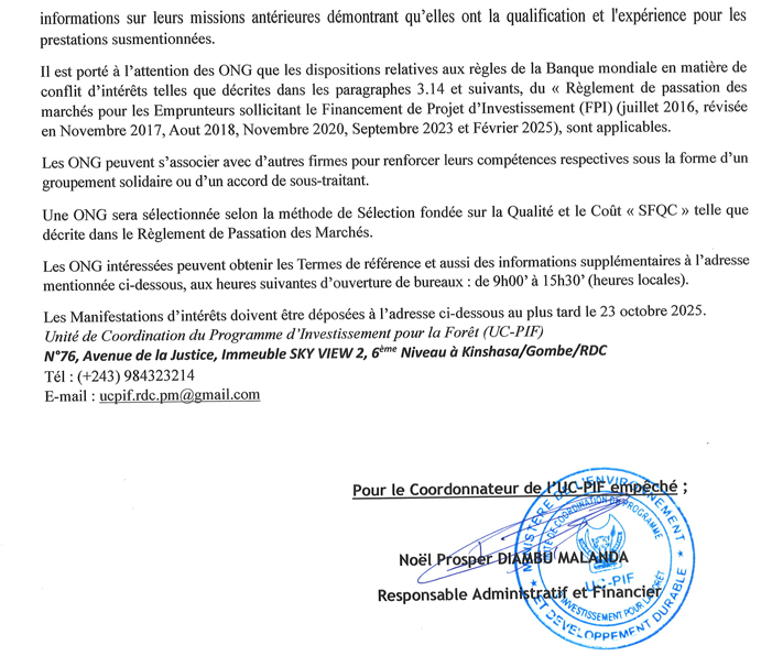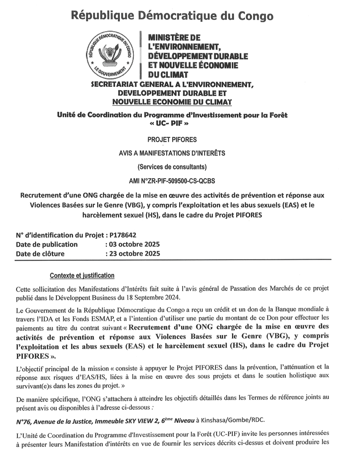 ONG chargée de la mise en oeuvre des activités de prévention et réponse aux VBG, y compris l'EAS et le harcèlement sexuel (HS), dans le cadre du Projet PIFORES