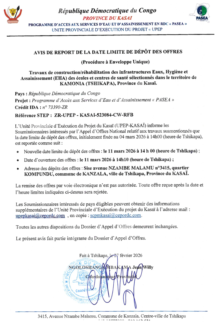 Taxes de construction/Réhabilitation des infrastructures Eaux, Hygiène et Assainissement (EHA) des écoles et centres de santé sélectionnés dans le territoire de Kamonia (Tshikapa)