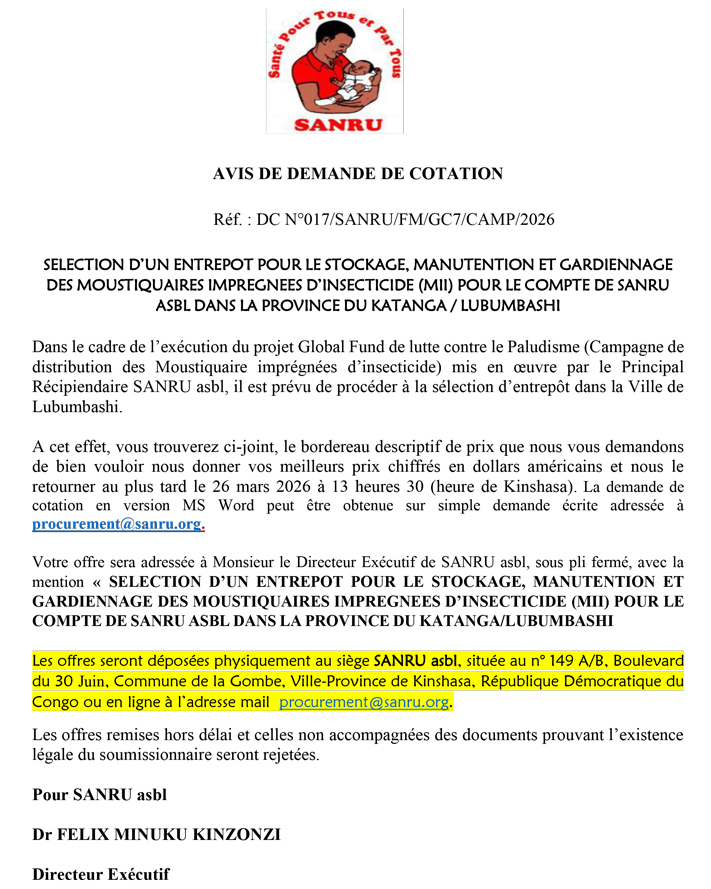 Entrepôt pour le stockage, manutention et gardiennage des Moustiquaires Imprégnées d'Insecticide (MII) pour le compte de SANRU Asbl dans la province du Katanga