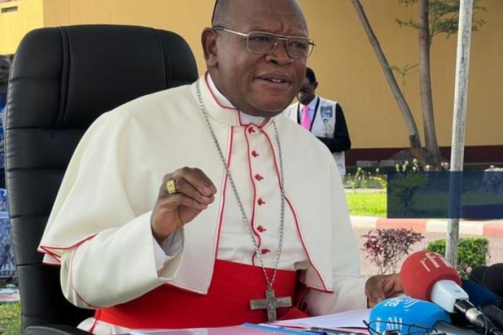 Devant la presse ce vendredi au centre Lindonge à Kinshasa, le cardinal Fridolin Ambongo fait la restitution de sa mission pastorale à Kwamouth dans le Maindombe où sévit le conflit intercommunautaire principalement entre les peuples Teke et Yaka.
