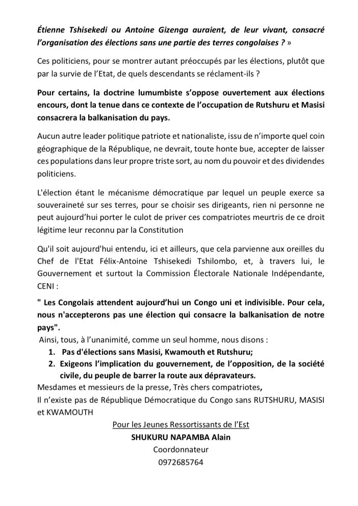 Les jeunes ressortissants de l’Est du pays s’opposent à l’organisation des élections sans les térritoires de Masisi, Rutshuru ( Nord-Kivu) et Kwamouth ( Mai-Ndombe). Dans une déclaration faite ce vendredi 7 juillet dont une copie est parvenue à Media Congo Press, ces jeunes recusent la convocation de l’électorat sans les réssortissants dans le contexte actuel où d’autres congolais seront exclus. Pour ces jeunes, organiser le scrutin sans Masisi, Rutshuru et Kwamouth s’est consacré la balkanisation du pays.