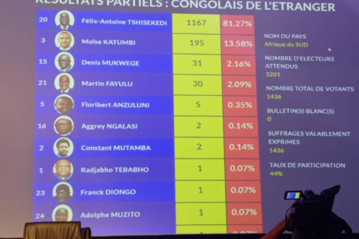 D'après les premières tendances publiées ce vendredi 22 décembre par la centrale électorale, le candidat numéro 20 Félix Tshisekedi vient en tête avec 81,27 % dans les 5 pays concernés par l'élection présidentielle, à savoir: la Belgique, le Canada, l'Afrique du sud, la France et les États-Unis d'Amerique.