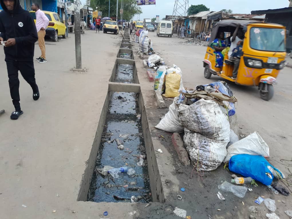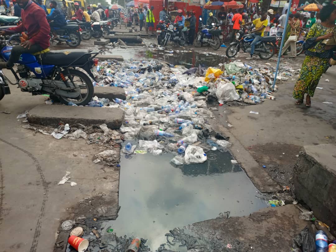 À la place des artistes dans la commune de Kalamu, à l'arrêt de bus et taxi bus de Lemba et Limete, on trouve un tas d'immondices en plastique qui obstrue le passage des eaux dans les caniveaux.