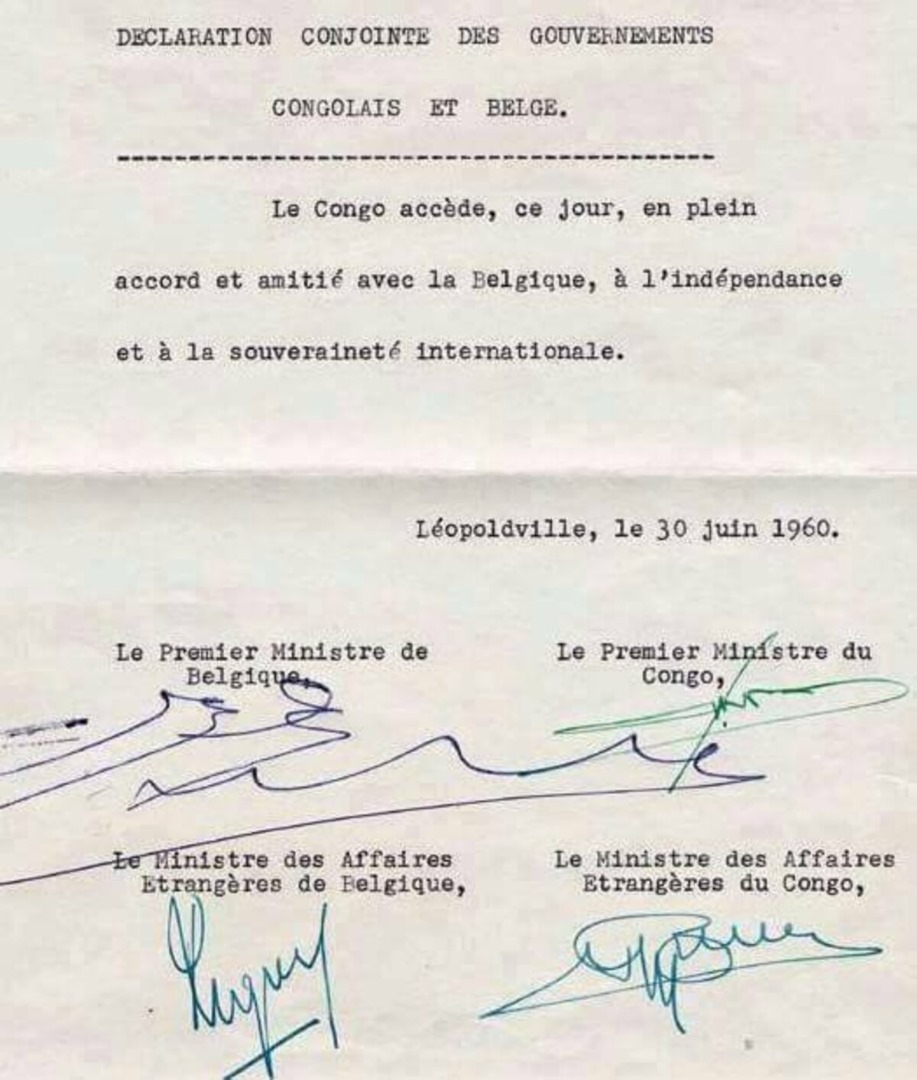 6. Après le discours de Lumumba, l’acte officiel de l’indépendance fut signé par les Premiers ministres Belge et Congolais, Gaston Eyskens et Patrice Lumumba, contresigné par les deux Ministres des Affaires Étrangères, Pierre de Vigny et Justin-Marie Bomboko.