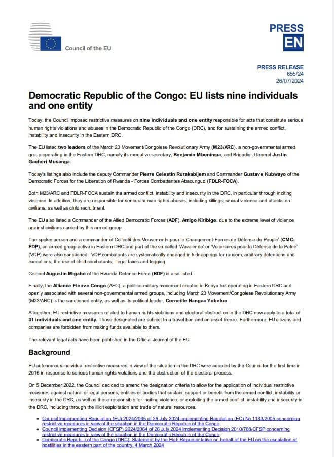 Quelques heures après avoir été sanctionnées par l'Office de contrôle des avoirs du Département des États-Unis d'Amérique, c'est le tour du Conseil européen d'imposer, ce vendredi 26 juillet 2024, des mesures restrictives à l'endroit de 9 personnes responsables de graves violations et atteintes aux droits de l'Homme dans l'Est de la République démocratique du Congo, ainsi que du maintien du conflit armé, de l'instabilité et de l'insécurité, indique un communiqué.