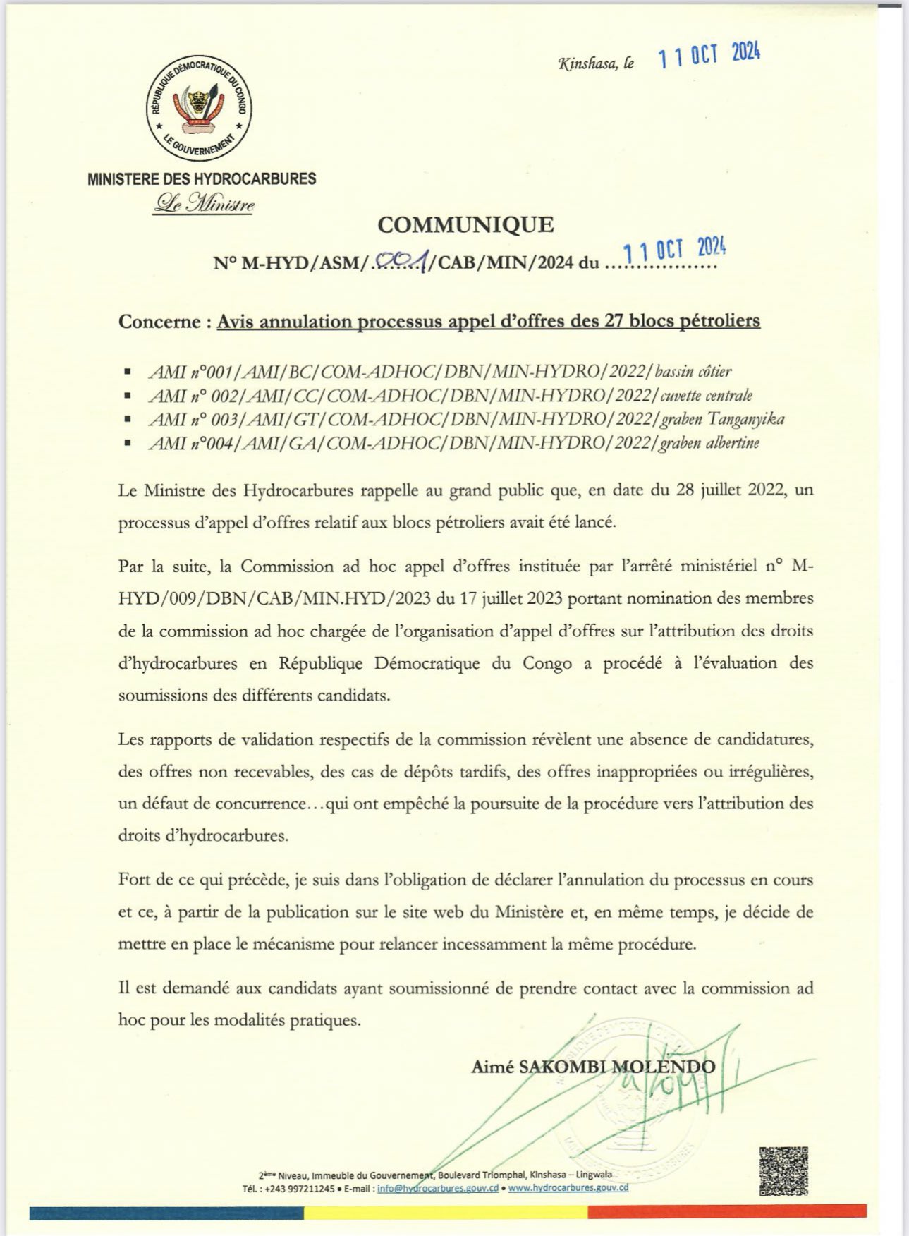 Le ministre des Hydrocarbures, Aimé Sakombi Molendo, souligne qu’il est demandé aux candidats ayant soumissionné de prendre contact avec la commission ad hoc, pour les modalités pratiques.