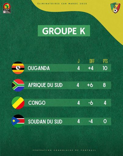 L’Ouganda est en tête du groupe K avec 10 points, tandis que l’Afrique du Sud occupe la deuxième place avec 8 points.