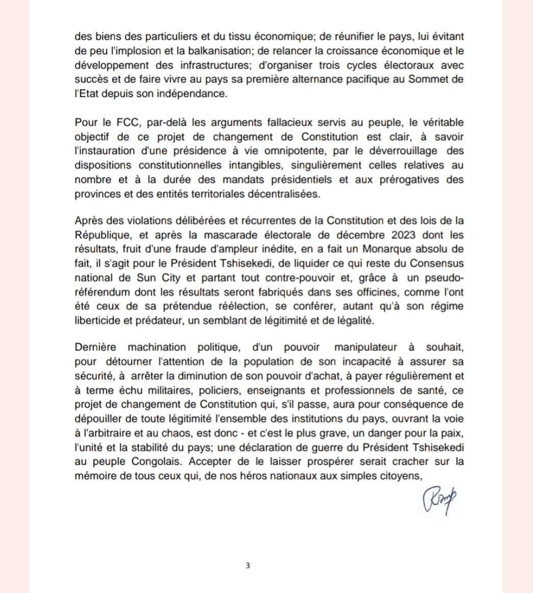 Pour ce faire, le FCC indique opposer un "non, catégorique et cinglant au « projet funeste » de Félix Tshisekedi. A cet effet, il lance un appel à toutes les forces politiques et sociales éprises de paix et de justice, « qui aiment réellement notre pays, se soucient du bien-être de notre population et sont opposées à la restauration de la dictature » pour, ensemble, mobiliser le peuple afin de faire barrage à ce projet de changement de la Constitution.