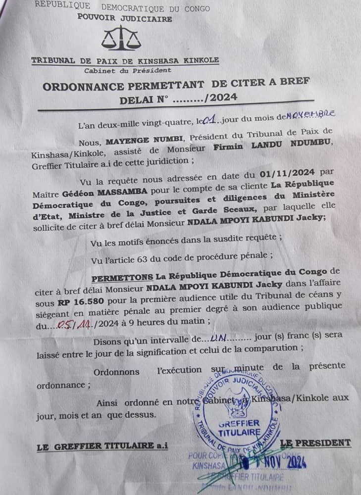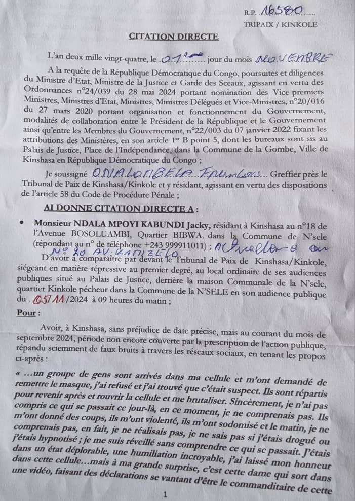 Après une première confrontation début octobre entre Jacky Ndala et Denise Mukendi au parquet de grande instance de Kinshasa/Gombe, où les deux protagonistes ont été entendus, aucune nouvelle date n’a été communiquée pour la suite de la procédure. En attendant, Denise Mukendi, qui avait affirmé,dans une vidéo,être à l’origine de l’agression de Jacky Ndala, continue de croupir à la prison centrale de Makala.