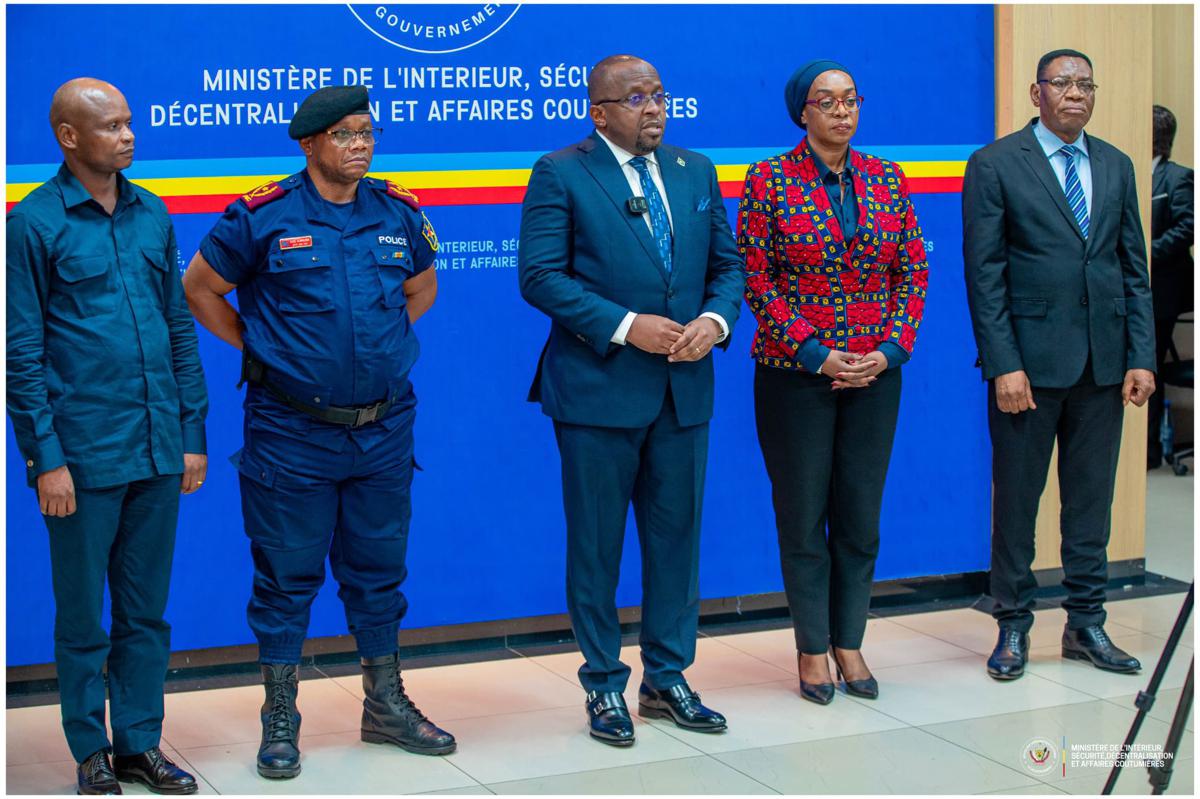 Le ministre de l’Intérieur Jacquemain Shabani, entouré de la ministre de la Culture et du chef de la Police dans la ville de Kinshasa, à l’issue de la réunion consacrée à la profanation du mausolée de P-E Lumumba, le 20/11/2024. Ministère de l'Intérieur