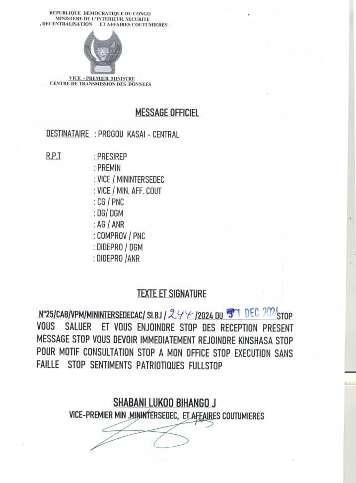 Le vice-premier ministre chargé de l'Intérieur, Jacquemain Shabani a convoqué, de manière urgente, le gouverneur de la province du Kasaï-Central, Joseph Moïse Kambulu.