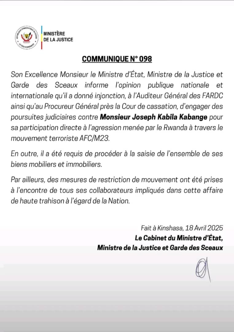 Dans un communiqué officiel daté du 19 avril 2025, le ministre d’État en charge de la justice et garde des sceaux, Constant Mutamba, annonce avoir ordonné l’ouverture de poursuites judiciaires contre l’ancien président Joseph Kabila Kabange. Il est accusé de « participation directe » à l’agression armée orchestrée par le Rwanda à travers le mouvement terroriste AFC/M23, qui occupe une partie de l’Est de la République démocratique du Congo.