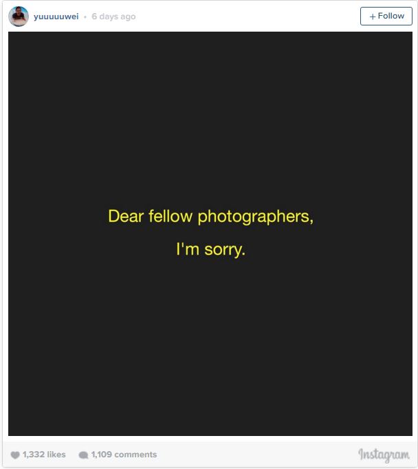Au lendemain de la mise au jour de la mascarade, le photographe a courbé l'échine sur Instagram en publiant un long message d'excuses.