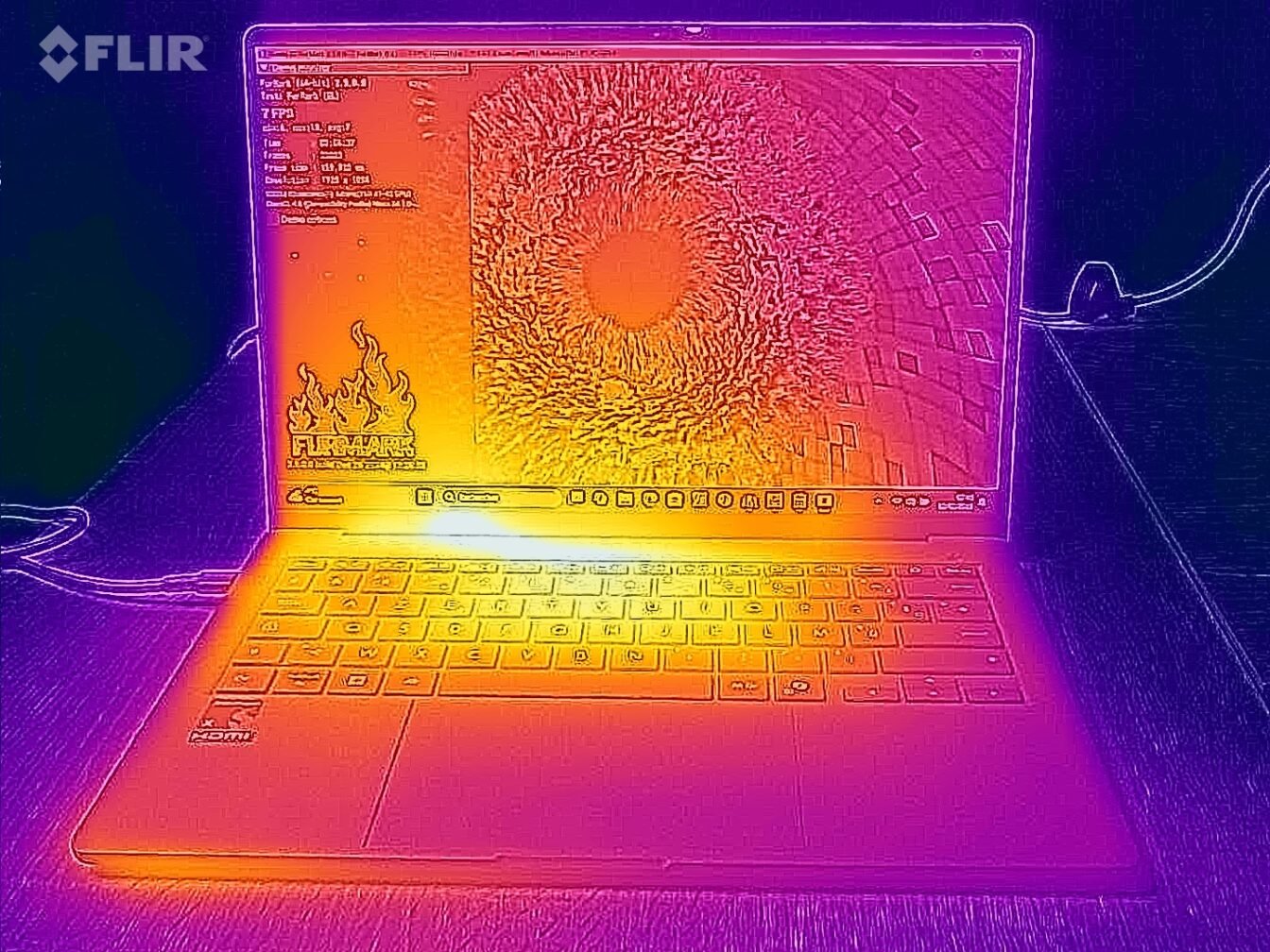 Le réglage d’usine du système de dissipation thermique privilégie visiblement le silence de fonctionnement à l’efficacité en matière de refroidissement. Les températures restent tout de même raisonnables, avec un point chaud mesuré à 23°C au niveau des paumes des mains, et une température maximale de 40,5°C à l’arrière.