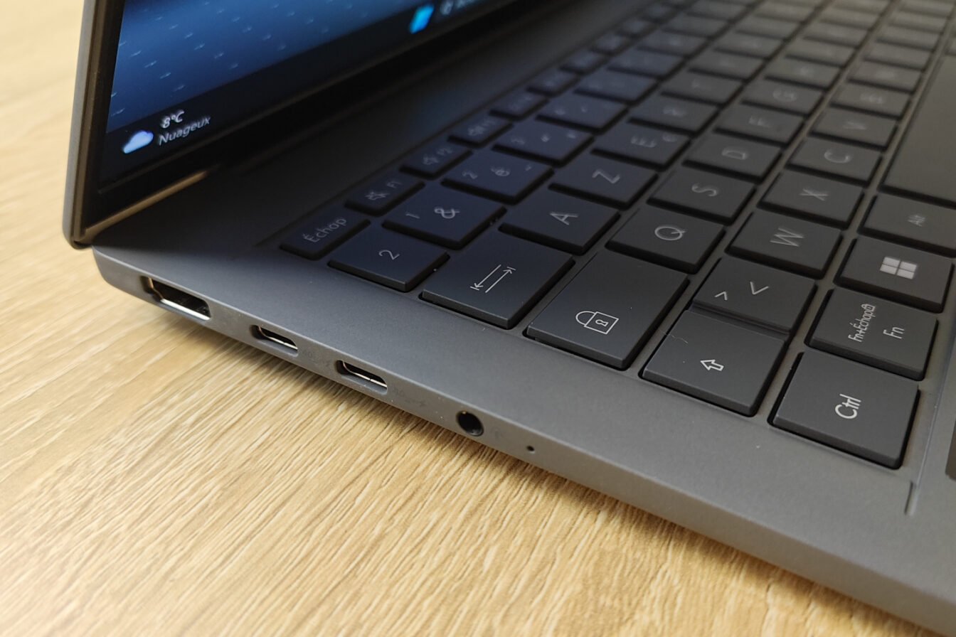 Avec une telle recherche de compacité et de légèreté, on aurait pu craindre que la connectique de ce Zenbook A14 se montre insuffisante, il n’en est rien. Asus a réussi à intégrer dans le châssis compact de cet ordinateur portable tout l’indispensable en la matière : deux ports USB 4 Type-C (compatibles Power Delivery et DisplayPort) sont présents sur la tranche gauche, aux côtés d’un port HDMI 2.1 et d’une prise audio combo. À droite, un port USB 3.2 Gen2 Type-A complète intelligemment l’ensemble. Seul petit regret, bien excusable : l’absence de lecteur de cartes mémoires.