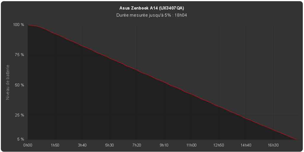 Le Zenbook A14 embarque, dans sa version de test présentée ici, une batterie à trois cellules de 70 Wh. La consommation raisonnable de la plateforme et de l’écran OLED permet à cet ordinateur portable d’atteindre une autonomie de 17 heures et cinq minutes (100% à 10%) avec notre nouveau protocole de test. En vidant totalement la batterie, l’autonomie atteint même 18 heures et 37 minutes, une valeur réellement impressionnante et parfaitement en accord avec le marché visée. La recharge complète prend quant à elle 2 heures et 5 minutes avec le chargeur de 65W livré avec l’appareil.