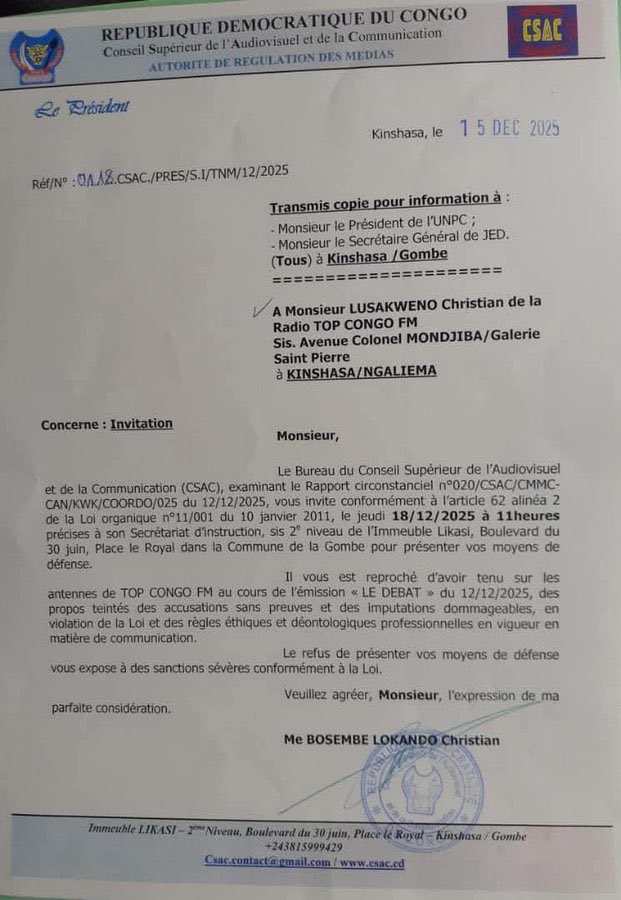 Le responsable de la radio Top Congo FM, Christian Lusakweno, est convoqué au Conseil supérieur de l’audiovisuel et de la communication (Csac) le jeudi 18 décembre 2025.