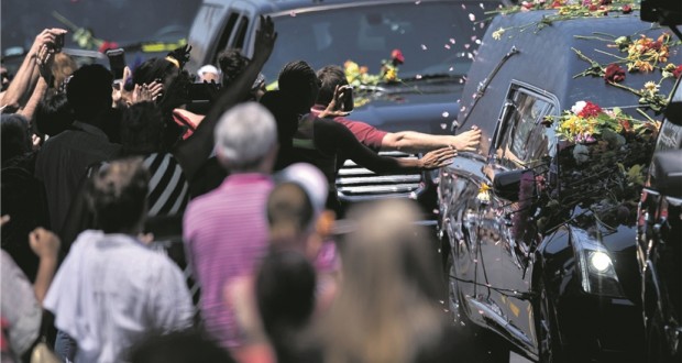 Ils ont brandi des pancartes, des ballons, des photos, des dessins. Et d’innombrables bouquets de roses qui ont fini par recouvrir le corbillard. Malgré la longue attente et la chaleur, certains anonymes n’ont pas quitté les gants de boxe qu’ils avaient enfilés en hommage à l’icône du pays.