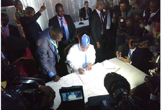 Le Facilitateur de l'UA, Edem Kodjo, lors de la signature de l'Accord du Dialogue nationale à Kinshasa, le 18 octobre 2016. (© Pius Romain Rolland)