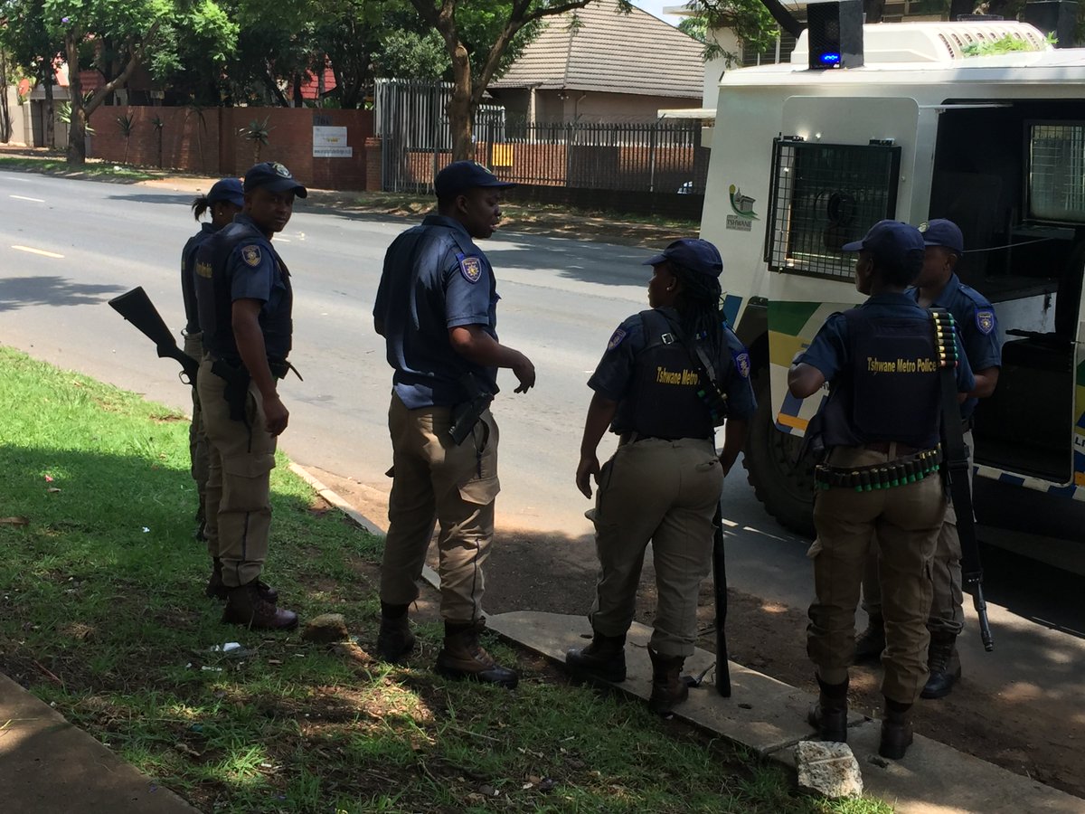 Policiers sud-africains en poste devant l'Ambassade congolaise à Pretoria (@ EWN Reporter, Twitter)