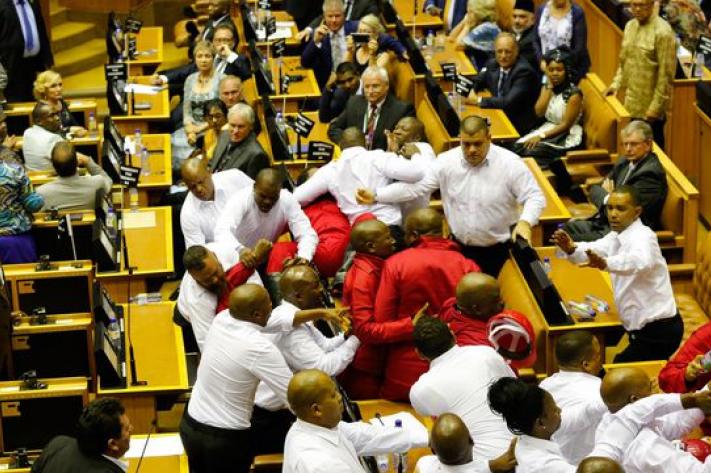 Les députés du parti sud-africain d'opposition des Combattants pour la liberté économique (EFF) ont échangé des coups avec des agents de sécurité qui les expulsaient jeudi du Parlement, après qu'ils eurent tenté d'empêcher le président Jacob Zuma de prononcer son discours annuel à la Nation.