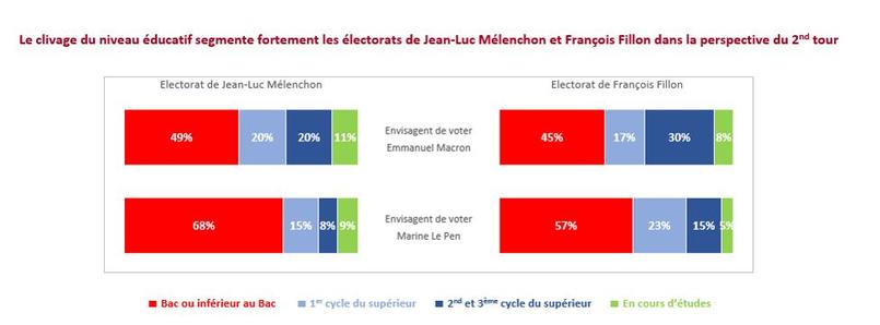Comme nous l'avons montré par ailleurs , le niveau de diplôme a constitué l'une des principales variables structurant les votes Macron et Le Pen au premier tour et c'est également en bonne partie sur cette ligne de partage des eaux que les électorats de Fillon et Mélenchon se scinderont au second tour.