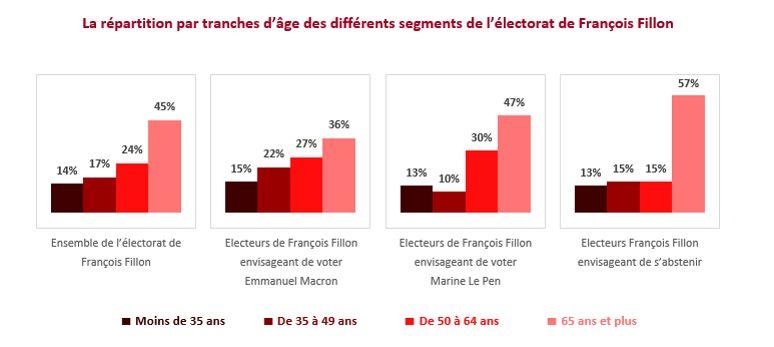 Un clivage générationnel est également à l'œuvre dans les rangs fillonistes mais il ne fonctionne pas selon la même logique. Si la proportion de moins de 35 ans est identique (et faible) dans les trois segments, on observe que les tranches d'âges intermédiaires (35-64 ans) sont surreprésentées (49%) parmi les électeurs optant pour Emmanuel Macron.