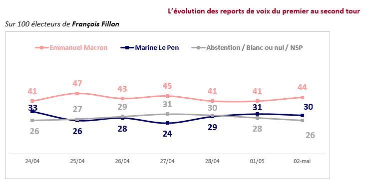 On constate la même tendance dans l'électorat filloniste, la part des adeptes du «bonnet blanc et blanc bonnet» étant passée de 26% à 28% en une semaine. Dans cet électorat également, le principe du front républicain ne semble pas aller de soi. Les électeurs fillonistes seraient même encore moins enclins que ceux de Jean-Luc Mélenchon à soutenir Emmanuel Macron: 41% contre 51%.