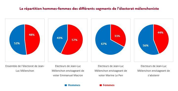 On constate ainsi que le segment des électeurs de la France insoumise qui a l'intention de pratiquer le front républicain est à nette dominante féminine alors que les hommes sont majoritaires dans le segment des abstentionnistes et encore plus nettement parmi ceux qui envisagent de voter pour Marine Le Pen.