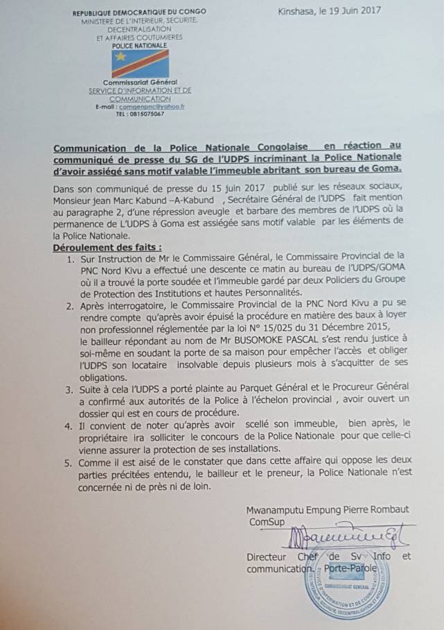 Je suis à goma, la maison dont udps utilise c'est une porte parmi les 4 portes de la maison sous forme de porte de commerce et la valeur vue le quartier c'est maximum 70$ dollars . Donc cet argument de la police est faux. Udps communique en écrivant sur le tableau et chaque jours c'est plein à craquer de gens pour lire et cela la majorité ne voit pas ça de bon œil.