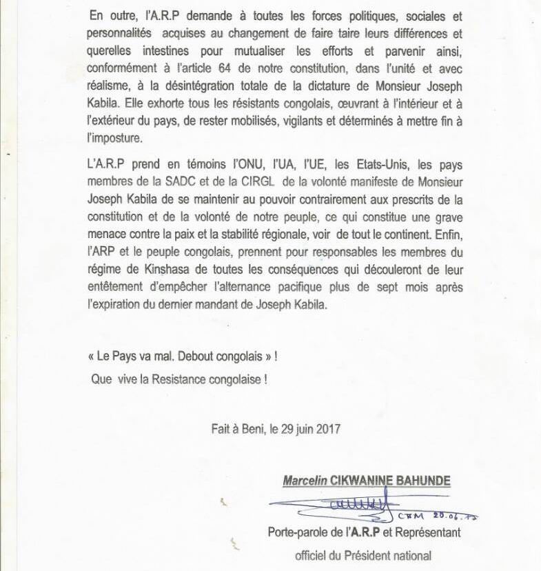 Le président national de l’Armée de Résistance Populaire (ARP), le général Faustin Munene, a rendu publique une déclaration politique le 29 juin dernier en rapport avec le message de la Cenco du 23 juin 2017.