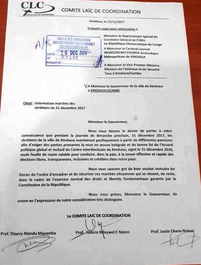 Dans leur correspondance du jeudi 28 décembre 2017 adressée au patron de l'exécutif de Kinshasa , les organisateurs font savoir que leur manifestation va partir des différentes paroisses et a pour objectif d'exiger l'application intégrale de l'accord du 31 décembre 2016 signé au centre interdiocésain pour la tenue rapide des élections libres et transparentes.