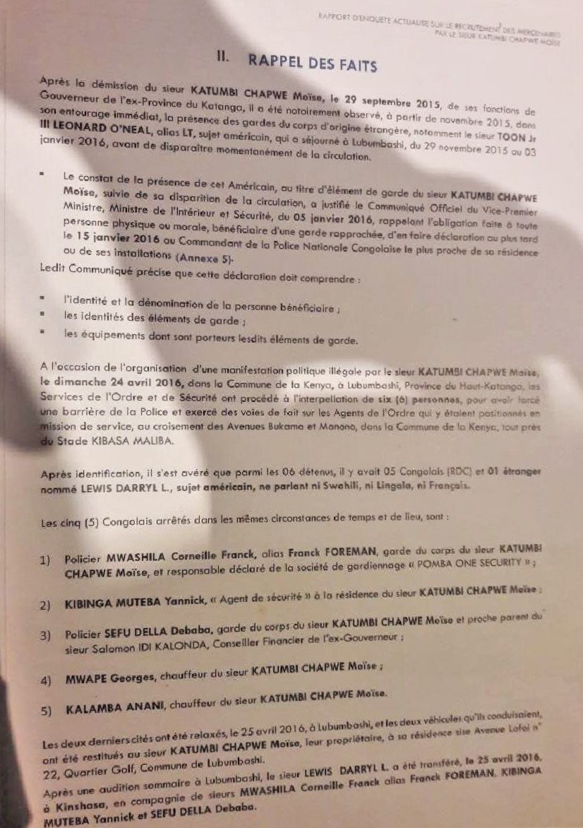 « Après la démission du sieur Katumbi Chapwe Moïse, le 29 septembre 2015, de ses fonctions de gouverneur de l’ex-province du Katanga, il a été notoirement observé, à partir de novembre 2015, dans son entourage immédiat, la présence des gardes du corps d’origine étrangère, notamment le sieur Toon Jr III Leonardo O’Neal, alias LT, sujet américain, qui a séjourné à Lubumbashi, du 29 décembre 2015 au 3 janvier 2016, avant de disparaître momentanément de la circulation », peut-on lire dans ce document de 208 pages, dont 39 annexes.