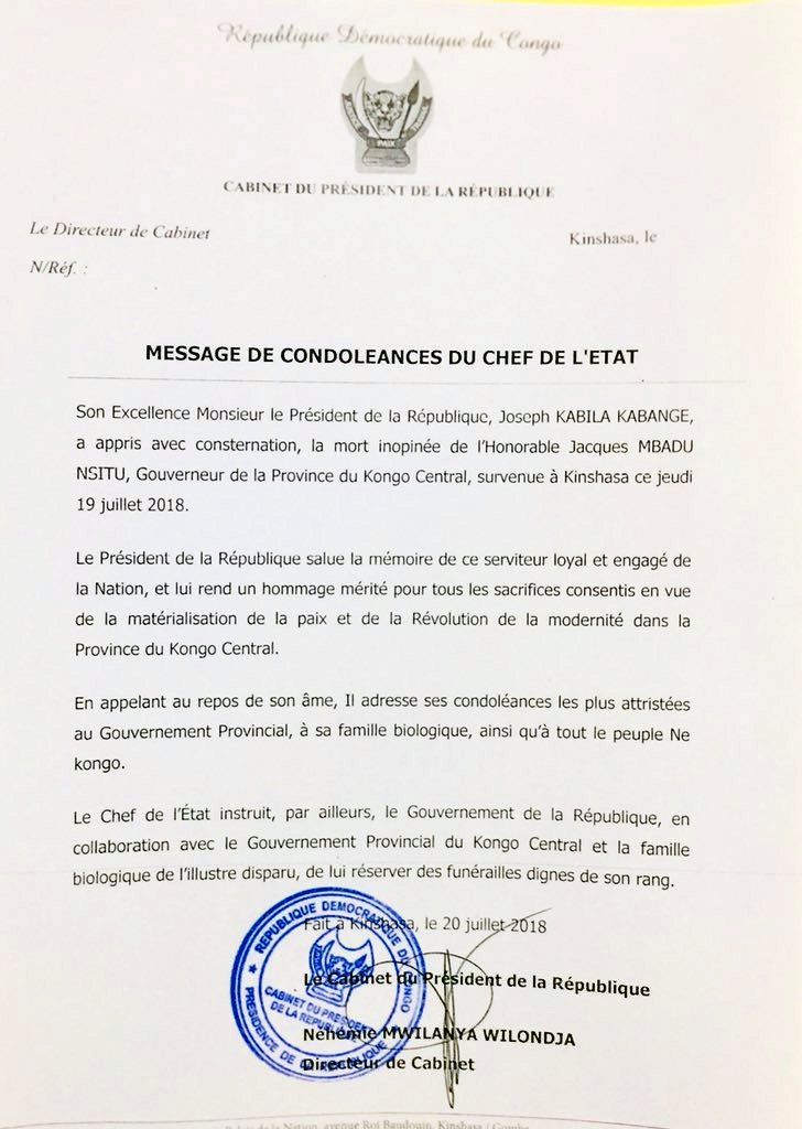 Le Chef de l’Etat, Joseph Kabila Kabange, a adressé vendredi 20 juillet 2018 un message de condoléances au gouvernement du Kongo Central et à la famille biologique du gouverneur Jacques Mbadu Nsitu décédé jeudi 19 juillet 2018 à l’hôpital du Cinquantenaire à Kinshasa.