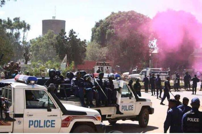 La Police dispersant la foule venue soutenir Moïse Katumbi lors de son audition au parquet au sujet de l'affaire de spoliation en Mai 2016. (© DR/Photo d'archives)