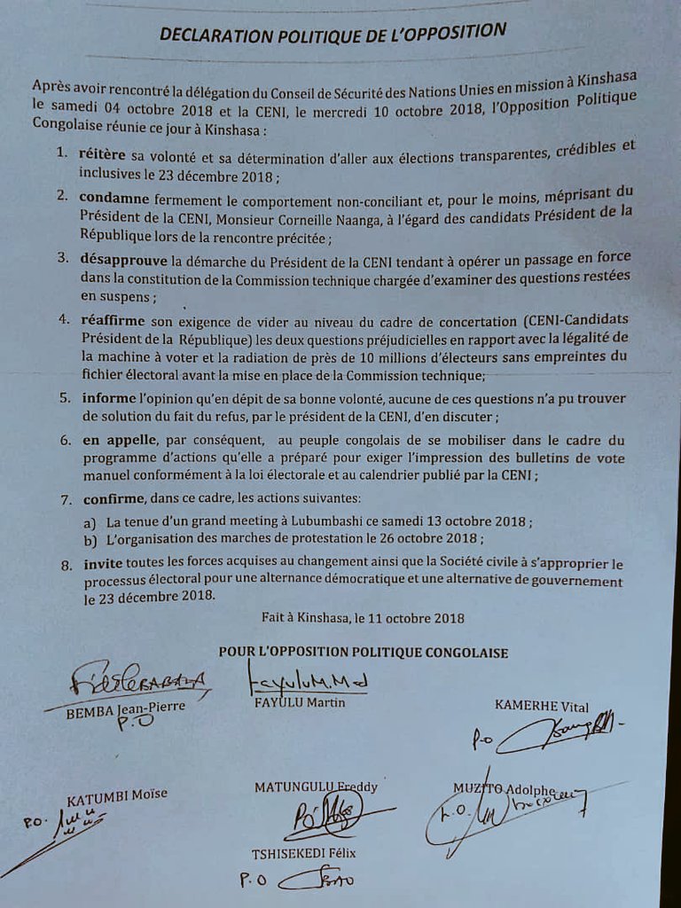 Ils ont exprimé cette position dans une déclaration signée par Jean-Pierre Bemba, Martin Fayulu, Vital Kamerhe, Moise Katumbi, Freddy Matungulu, Adolphe Muzito et Félix Tshisekedi ainsi que leurs représentants.
