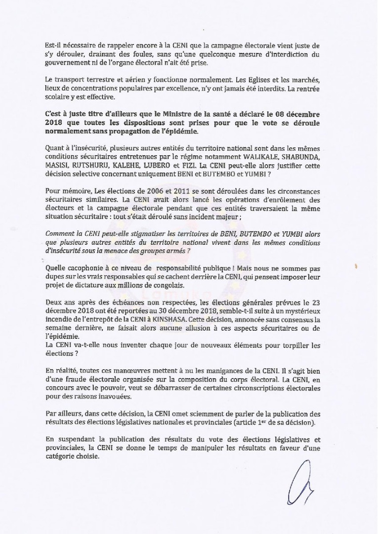 Il faut continuer à manifester contre cette décision illégale de la Céni qui viole art 5 Constituion le principe du suffrage universel(fondement de la souveraineté populaire et égalité entre citoyens),décision qui n'a pour objet, que d'éliminer par des calculs politiques les électeurs des basions favorables à l'opposition Si Béni et Butembo sont exclus pour des raisons sanitaires,pourquoi pas l'Ituri,Ebola sévit aussi la-bas Si on évoque des raisons sécuritaires,pourquoi inclure Lubero, les milices y font régner l'insécurité???