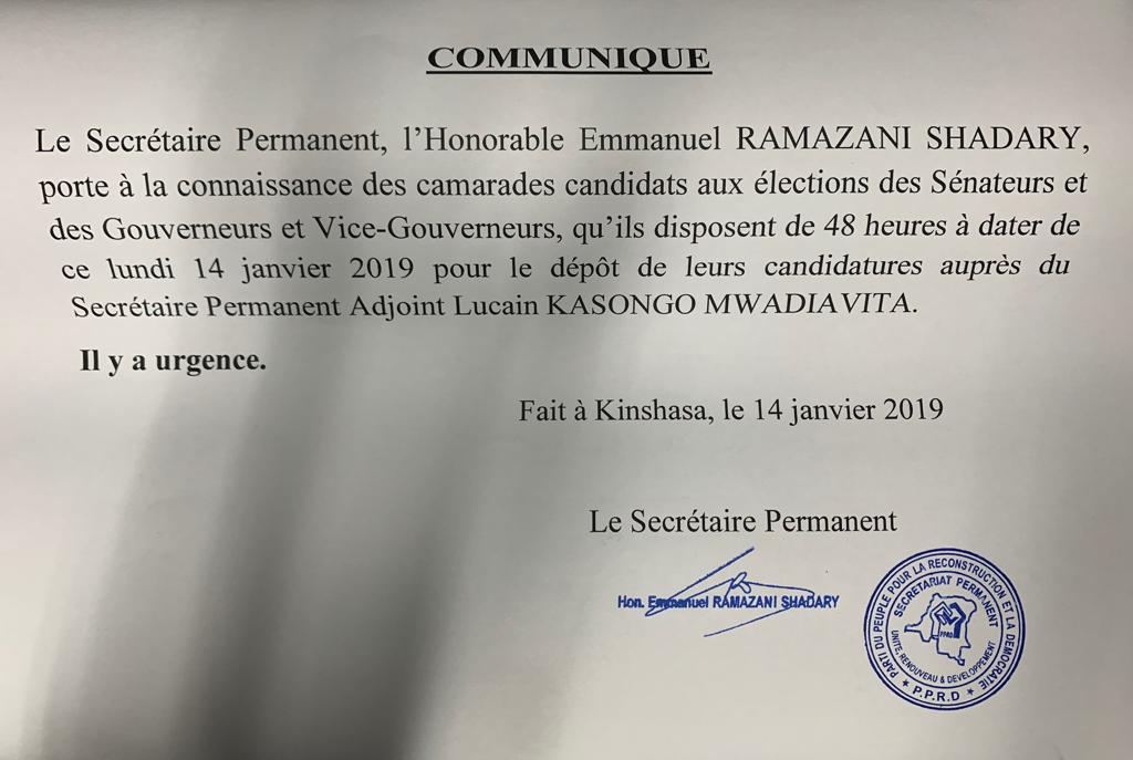 Dans un communiqué publié ce lundi 14 janvier signé par Emmanuel Ramazani Shadary, le Secrétaire permanent du Parti du peuple pour la reconstruction et la démocratie (PPRD) donne 48 heures aux candidats désirant concourir à ces deux scrutins à soumettre leurs dossiers au siège du parti.