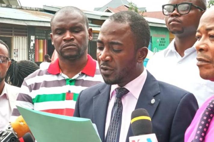 Jean-Paul Lumbulumbu entouré des cadres Lamuka lisant la déclaration de rejet des résultats de la présidentielle de décembre 2018. (© Laprunellerdc.info)