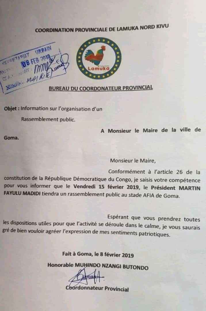 Dans une correspondance signée par le coordonnateur provincial de la coalition "Lamuka", Mohindo Nzangi, cette plateforme politique informe le maire de la ville de Goma de la tenue de ce meeting et lui demande de prendre des dispositions utiles pour que l'activité se déroule dans le calme.