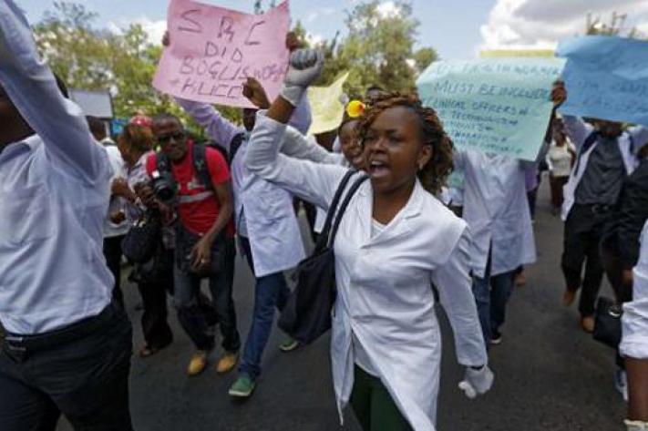 « Je suis docteur Shasha Mabika. Nous ne voulons pas que les fictifs, estimés à plus de vingt-huit mille, [puissent] bouffer la prime tous les mois. Par exemple mon cas, depuis 2013, médecin lutteur de notre pays, sans salaire, sans prime de risque ! Nous disons non et non ! ».