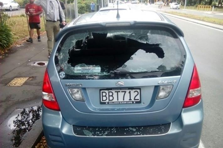 Des passants se tiennent près d'une voiture aux vitres brisées près de la mosquée où s'est produit une fusillade, le 15 mars à Christchurch© AFP Pete MARSDEN