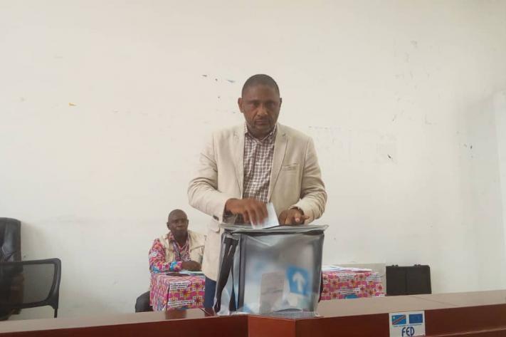 Gérard Mulumba, dit Gecoco, (député de l'UDPS) introduit le bulletin de vote dans l'urne pour le compte de l'élection des sénateurs à Kinshasa