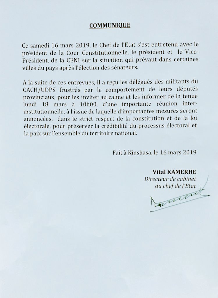 Dans un communiqué publié samedi 16 mars, le directeur de cabinet du président de la République, Vital Kamerhe, confirme un entretien qu'a eu le chef de l'État avec le président de la Ceni et son adjoint, à propos de la situation qui prévaut dans certaines villes du pays après l'élection des sénateurs.